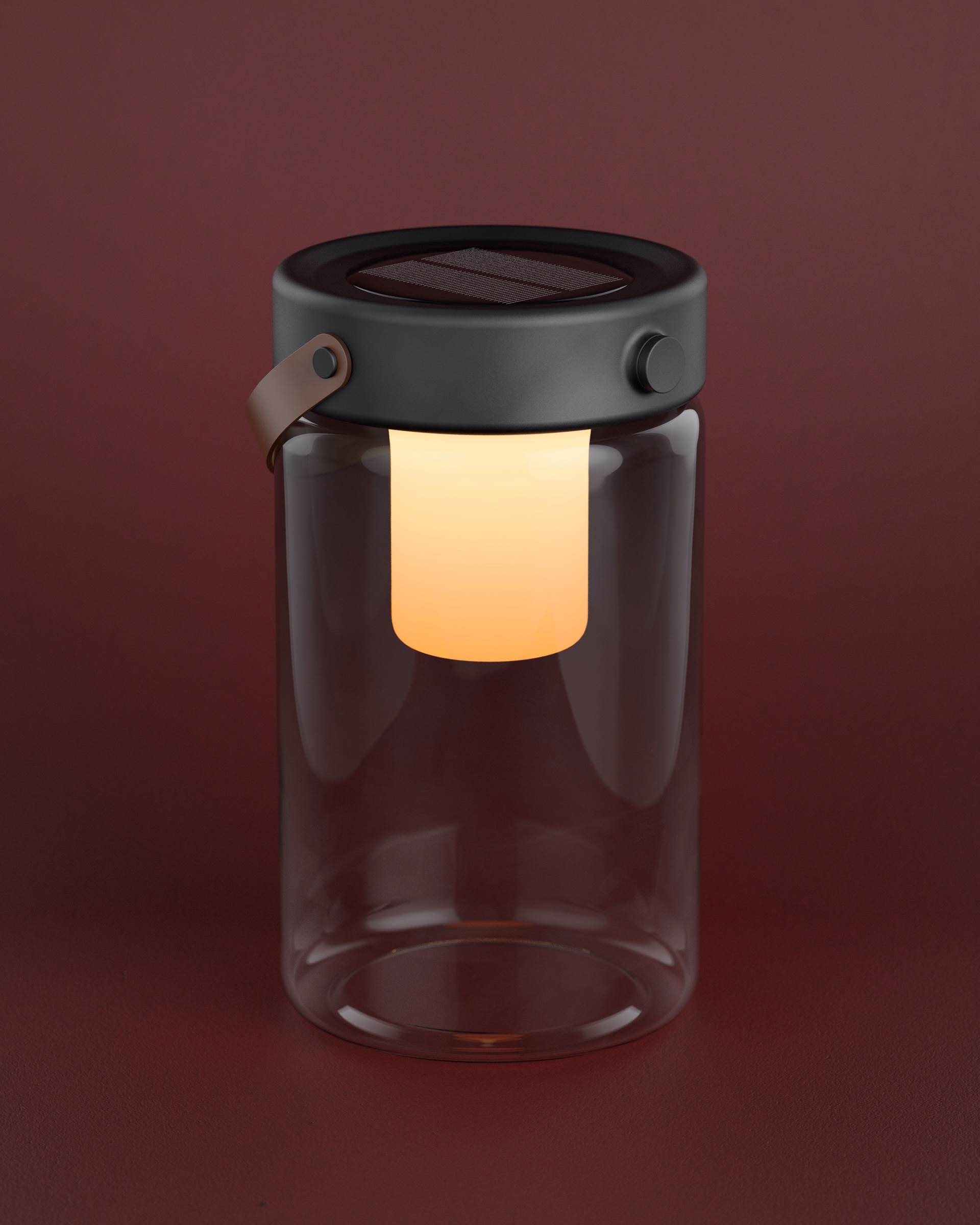 The lamp has a solar cell on its bottom for portability and easy charging while still being able to be used. The lamp can stand on its top, on its bottom and also be hanged using the leather strap. The only button is the turning knob for choosing the strength of the light.